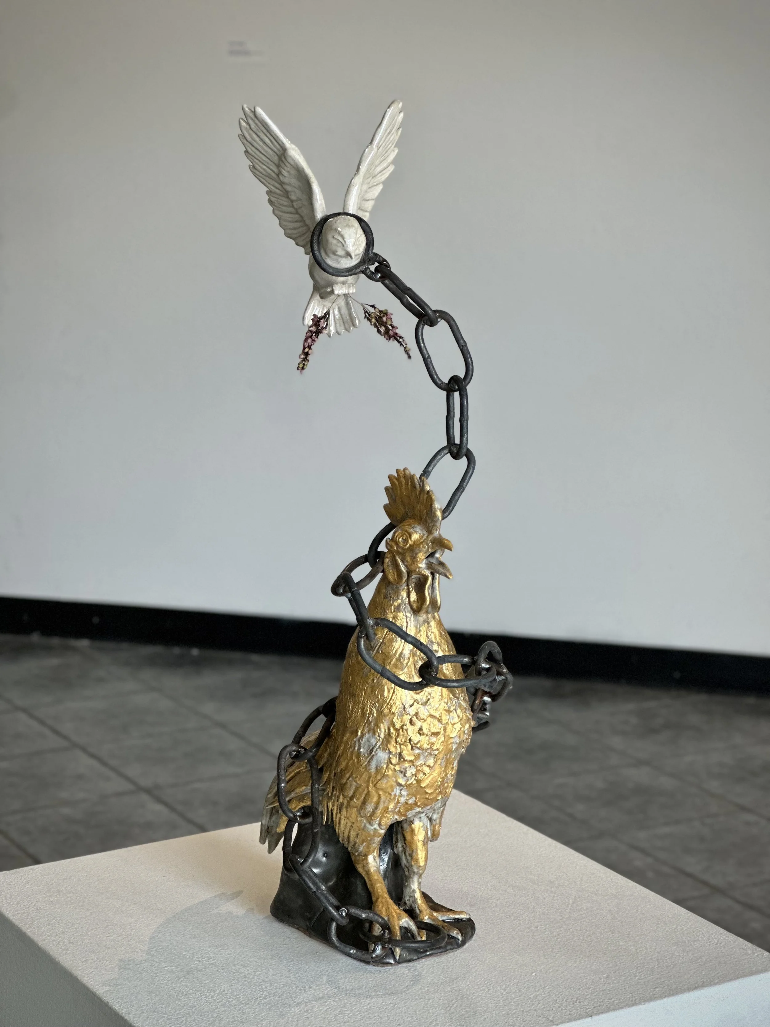 Modeling animal forms out of clay is something that I not only enjoy but excel at, and communicates my intent effectively through metaphor. The rooster was glazed and fired with a bland color of glaze base, then gilded with 24k gold leaf in a sporadic configuration as to show some of the surface glaze underneath. This is to portray the idea that the patriarchy often holds the power but is nothing more than ordinary at the heart of it. The songbird has a subtle opalescent luster overglaze to show how bright and beautiful femineity is. The hand-forged steel chain symbolizes how difficult it is for women to escape the patriarchy. I chose to make the chain myself, rather than using a prefabricated chain, hoping the viewer feels the sweat and blood it took to make while realizing our society makes these chains itself for women to wear.